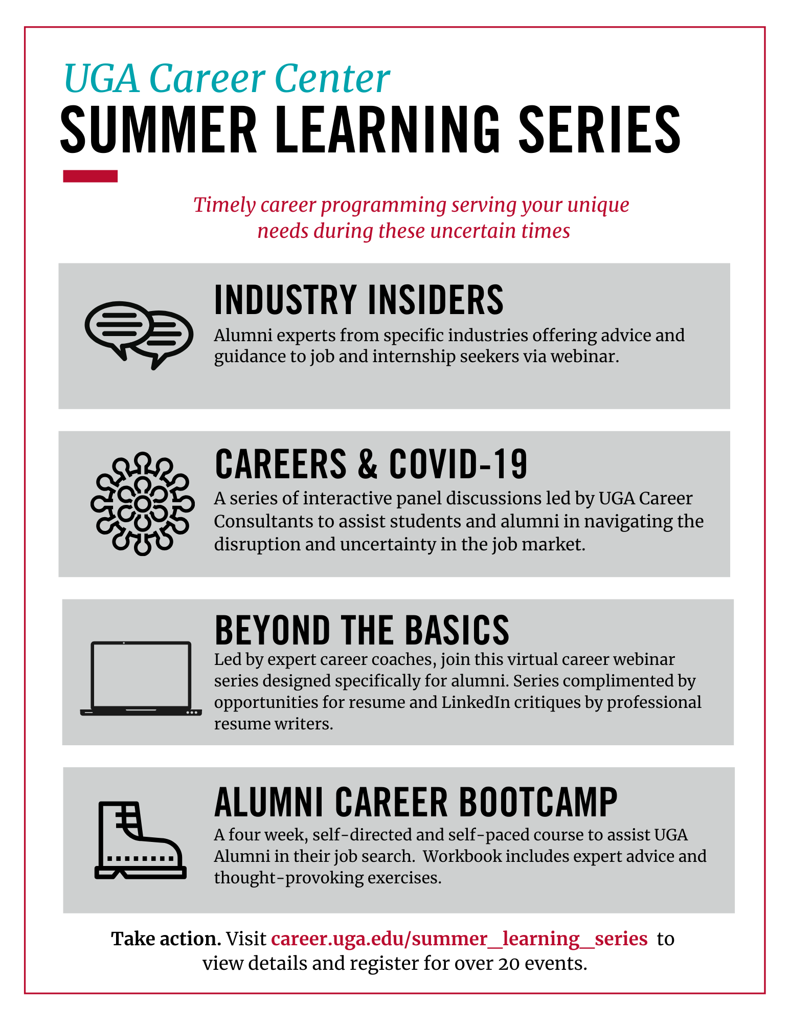 The University of Georgia now offers a free 4-week course for all UGA alumni to assist them in their job search. Tips and strategies in this course will help alumni understand what employers in today’s market are looking for in their new hires.