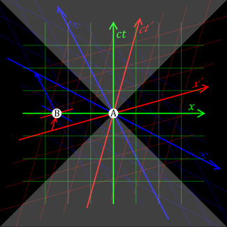 Image, via wikimedia commons. Event B is simultaneous with A in the green reference frame, but it occurred before in the blue frame, and will occur later in the red frame.